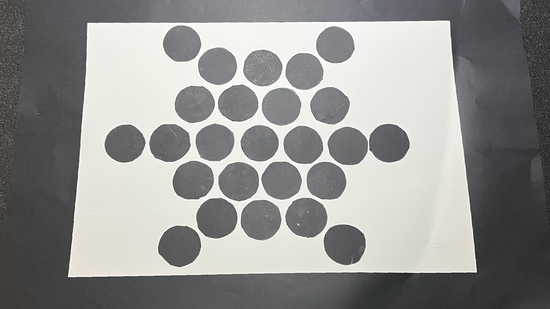 For the second piece, the circles, I laid them out in a hexagonal shape. Nineteen circles can compose a hexagon, leaving out just six of them which I stuck in the corners! This is probably the simplest of them all, but hey, hexagons are the bestagons.