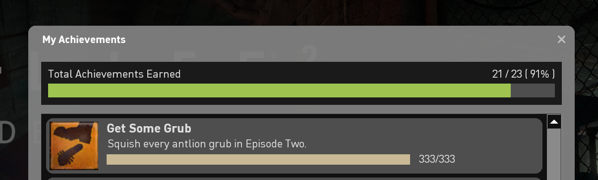 So uhh… yeah… This is the rarest achievement in any of the HL2 games, having been achieved by only ~7.5% of players*, and now one of them is me.